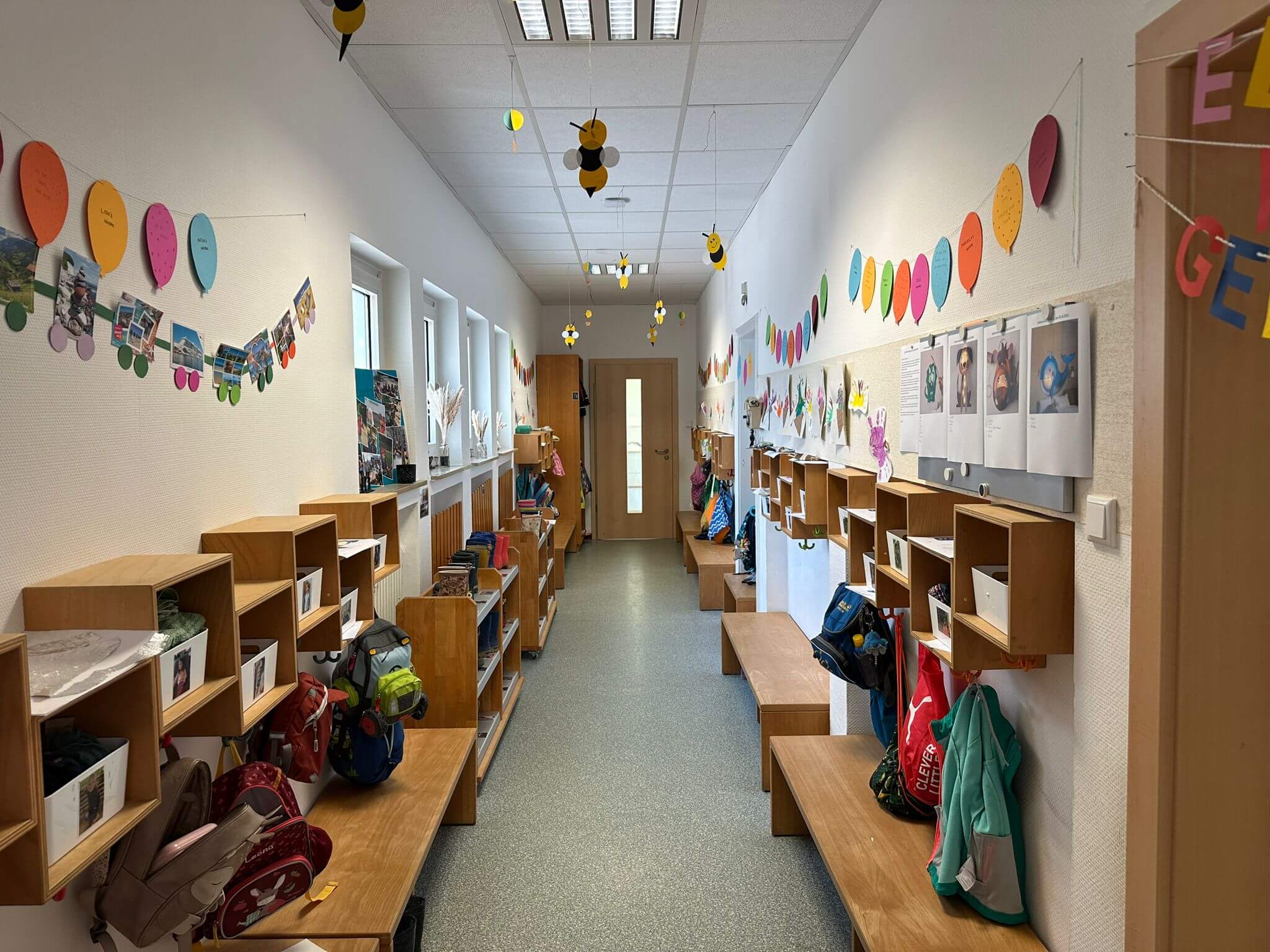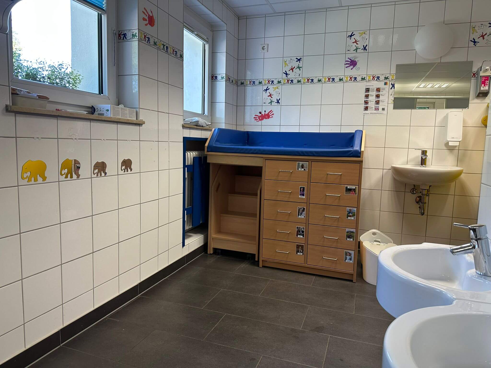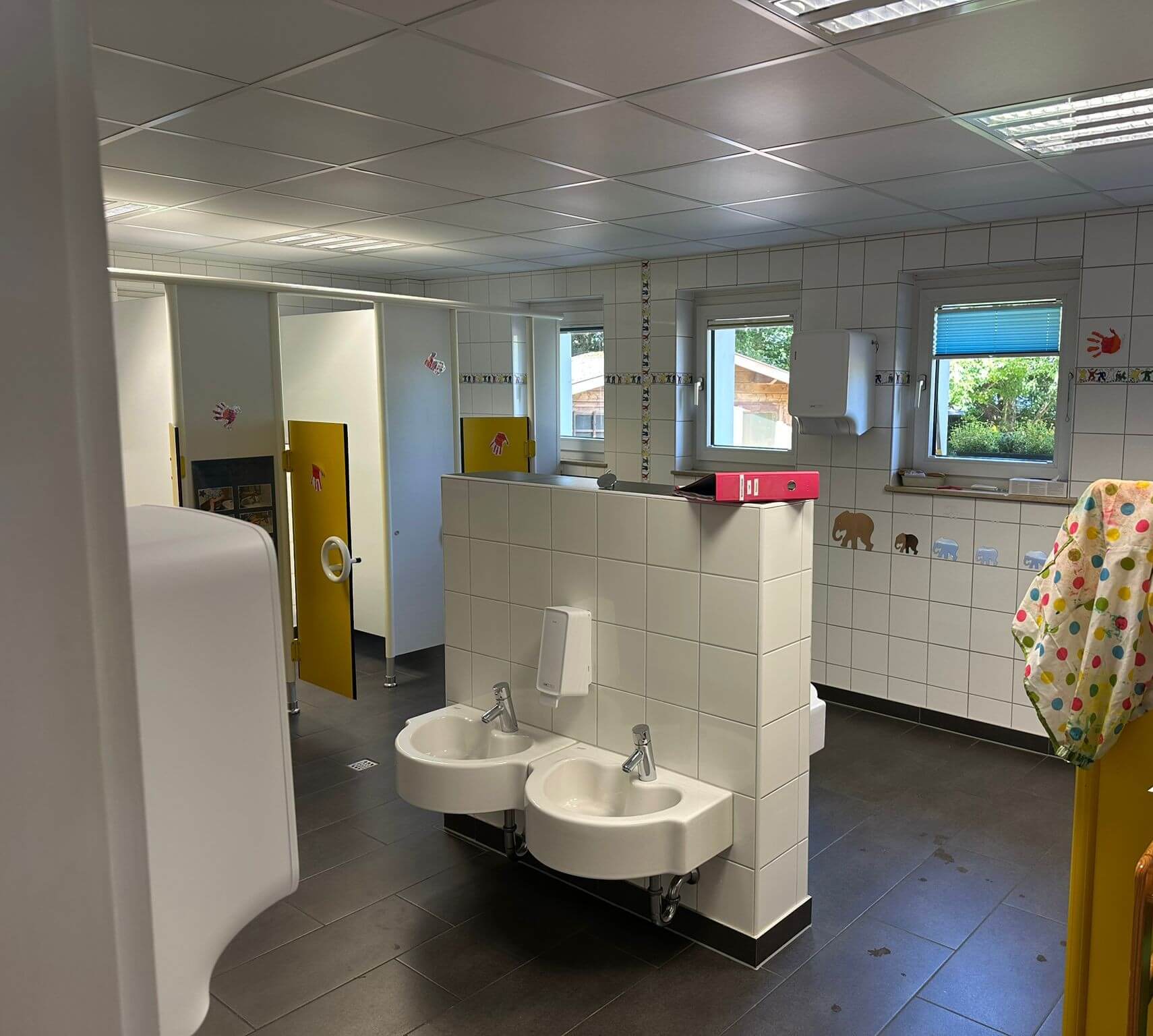 Der kindgerecht ausgestattete Waschraum verfügt über drei Toiletten und vier Waschbecken in verschiedenen Höhen – so können auch die Kleinsten alles gut erreichen. Auch ein Wickeltisch hat hier seinen festen Platz. Direkt angrenzend liegt das separate Personal-WC. Alle Räume sind durch einen hellen Flur miteinander verbunden, der zusätzlich als Begegnungs- und Bewegungsfläche dient.