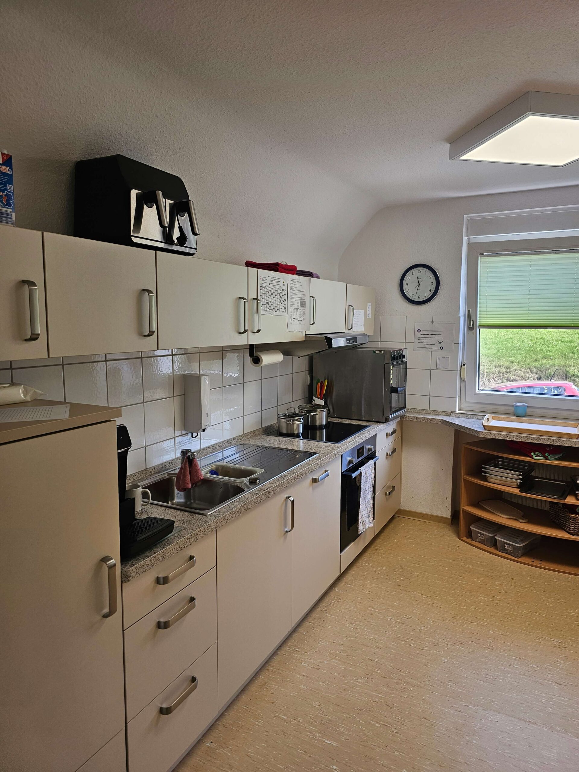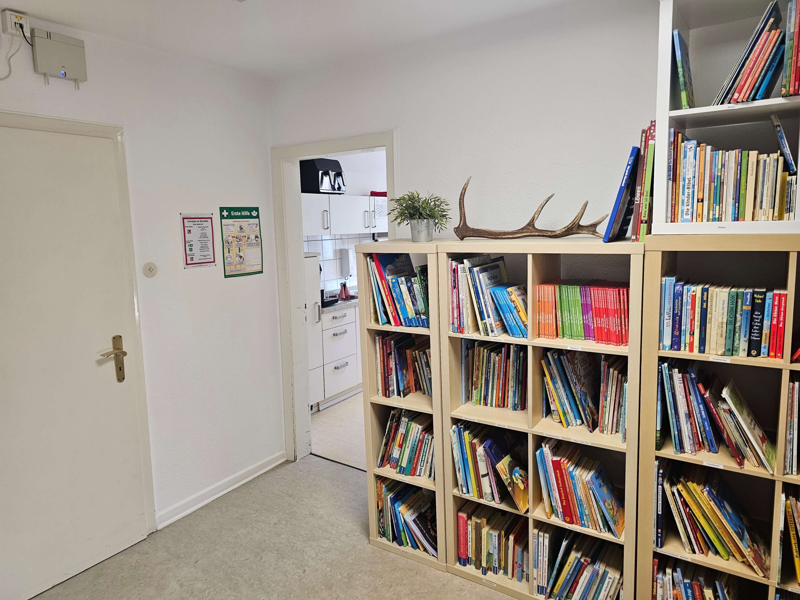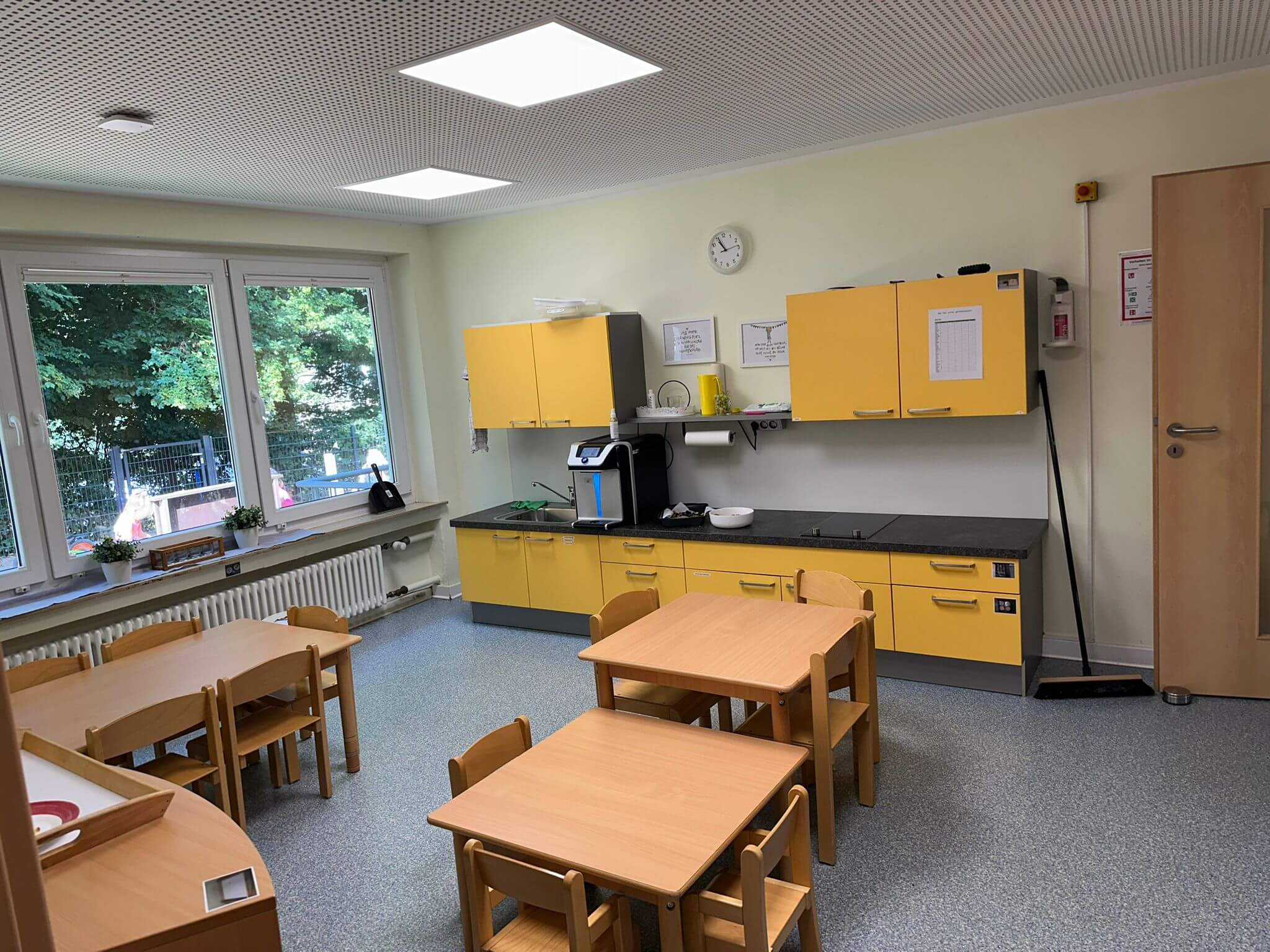 Der kindgerecht ausgestattete Waschraum verfügt über drei Toiletten und vier Waschbecken in verschiedenen Höhen – so können auch die Kleinsten alles gut erreichen. Auch ein Wickeltisch hat hier seinen festen Platz. Direkt angrenzend liegt das separate Personal-WC. Alle Räume sind durch einen hellen Flur miteinander verbunden, der zusätzlich als Begegnungs- und Bewegungsfläche dient.
