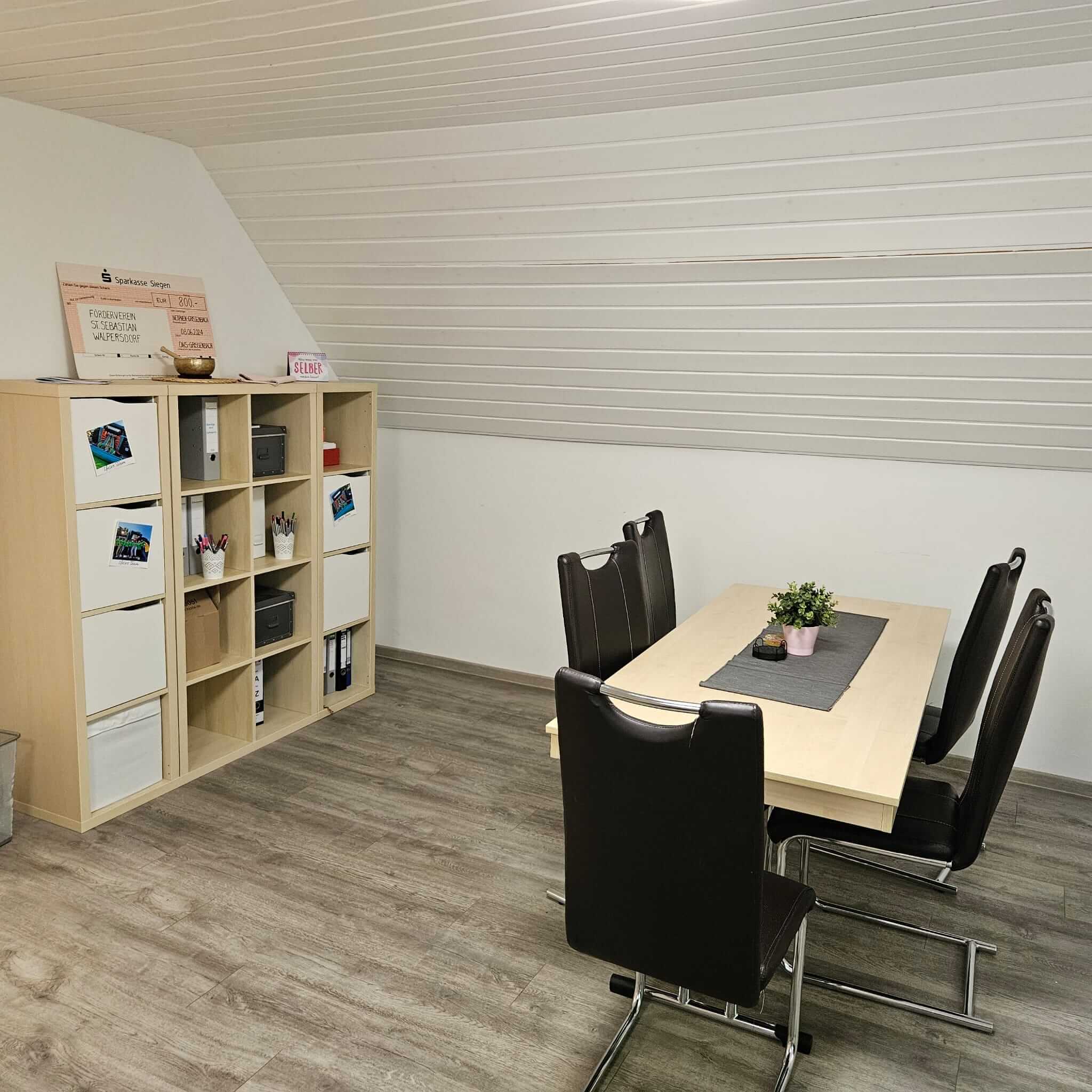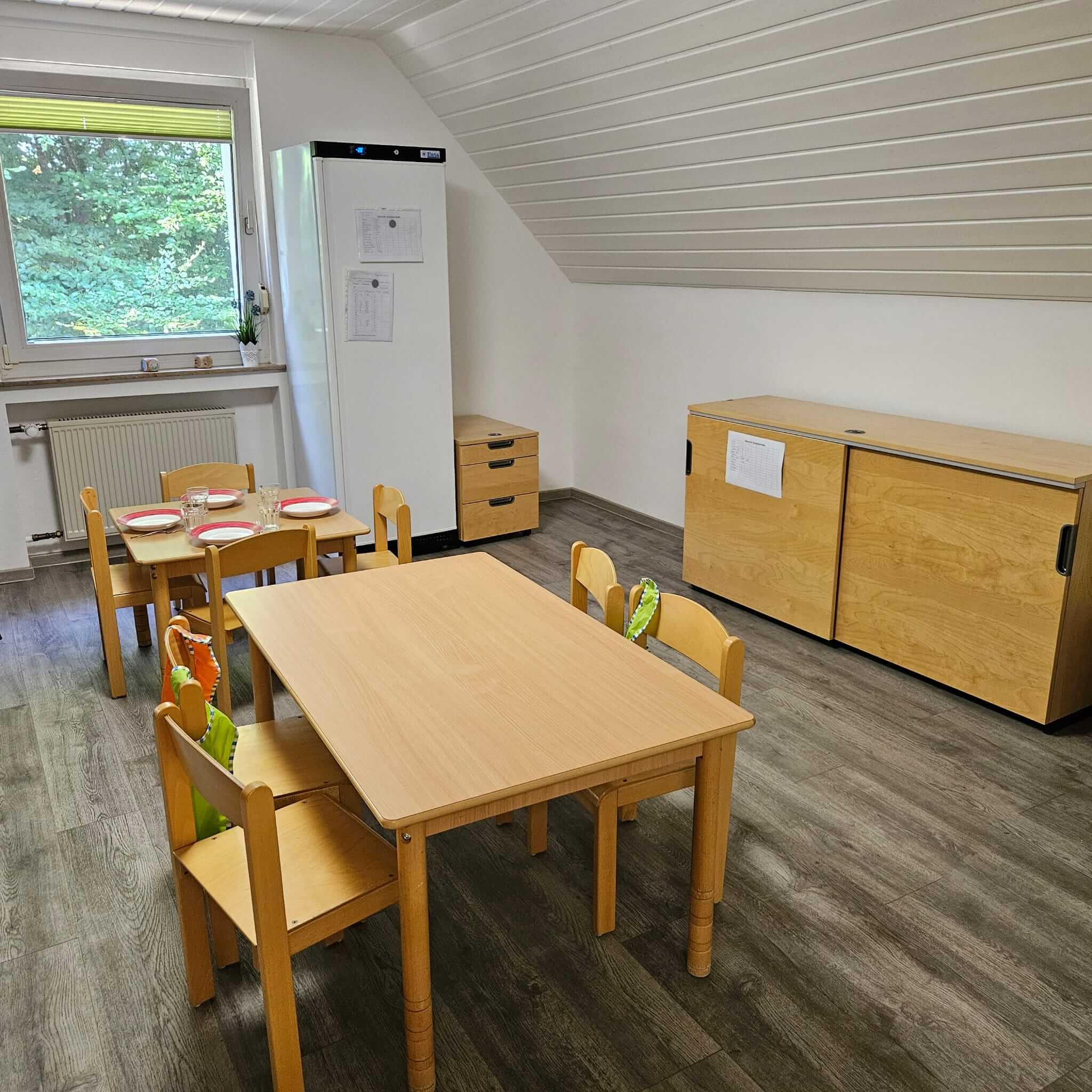Im Obergeschoss befinden sich das Büro, die Küche, ein Hauswirtschaftsraum sowie der Personalraum. Zum Mittagessen treffen sich die Kinder in einem zweiten Kinderrestaurant, das viel Platz für gemeinsames Essen und Austausch bietet. Außerdem steht ein großer Speicherraum zur Verfügung.